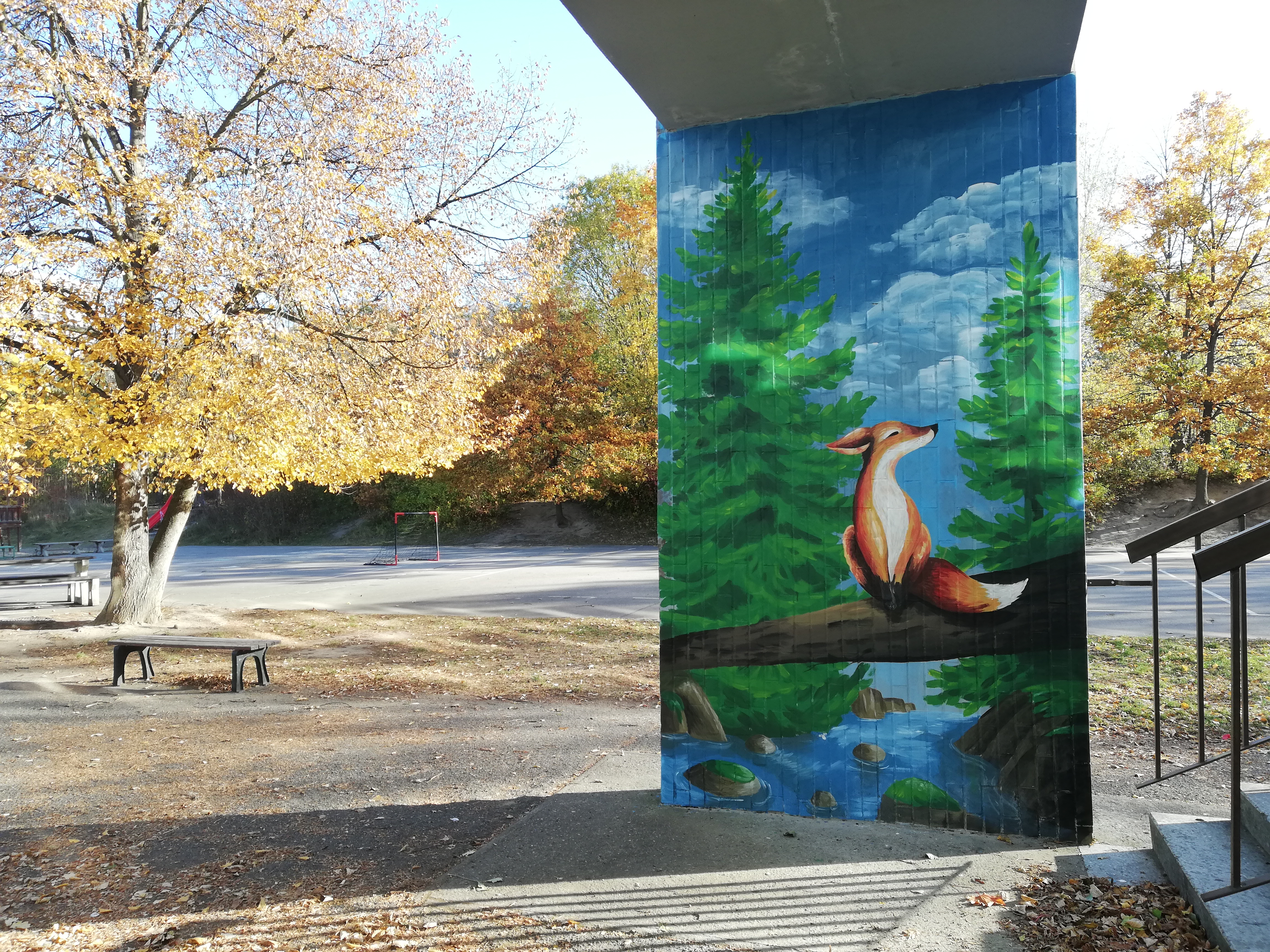 Nejrozměrnější část malby, les a lesní zvířata, se nachází na prostranství hřiště. Autorkou ukázek je Štěpánka Koutná.